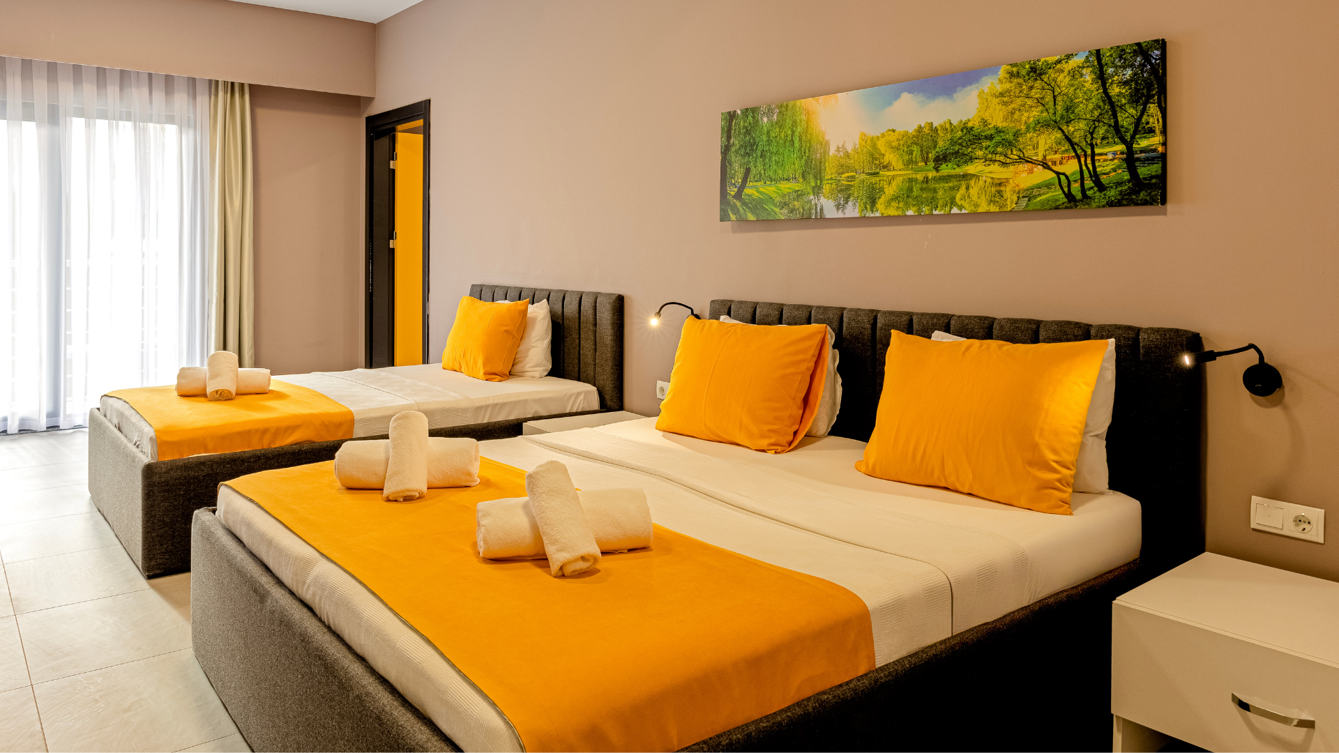 Geniş ve ferah alanlar sunan rahat odalarda, her anından keyif alacağınız yepyeni aile boyu tatilin keyfini çıkarın.