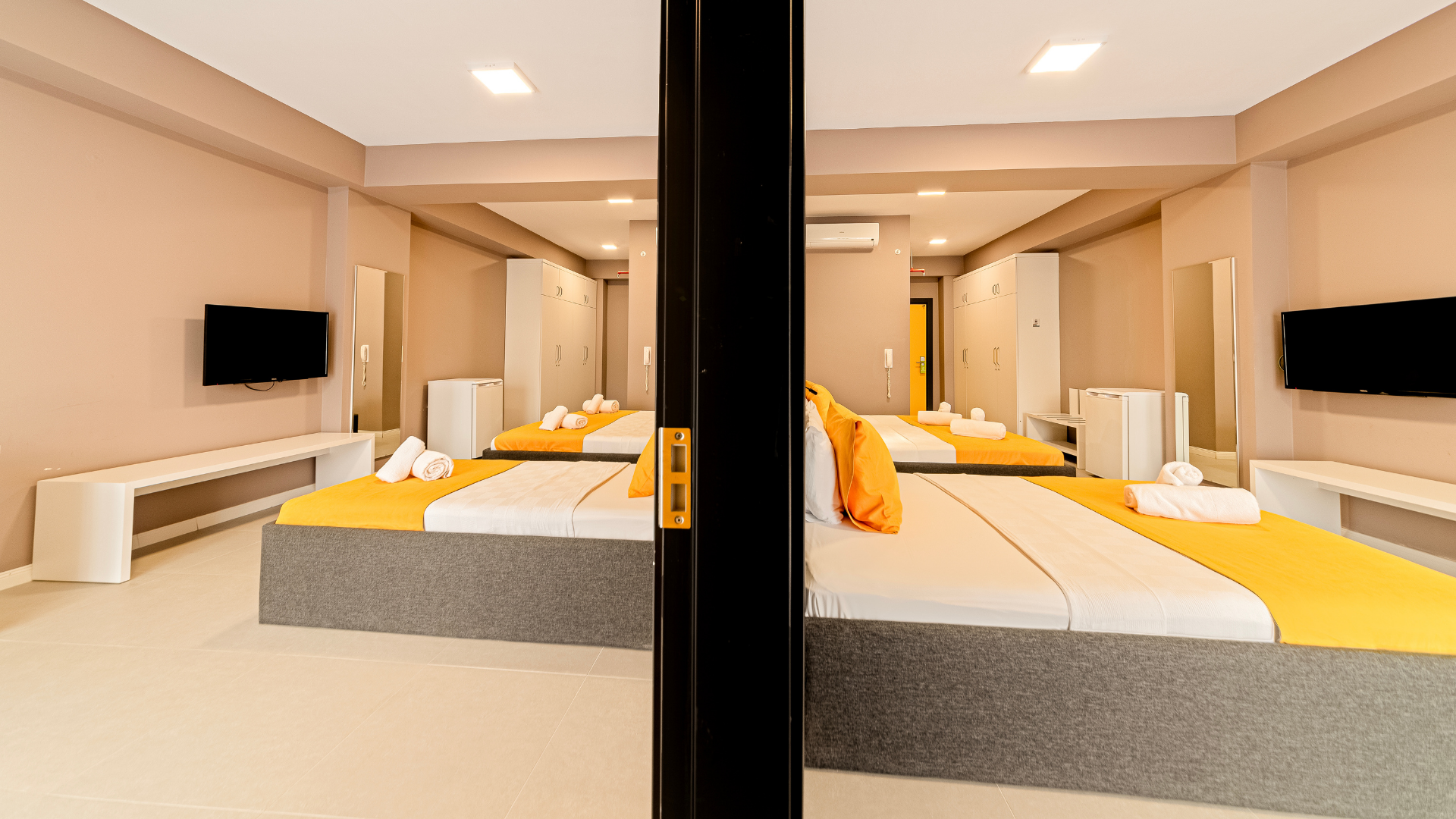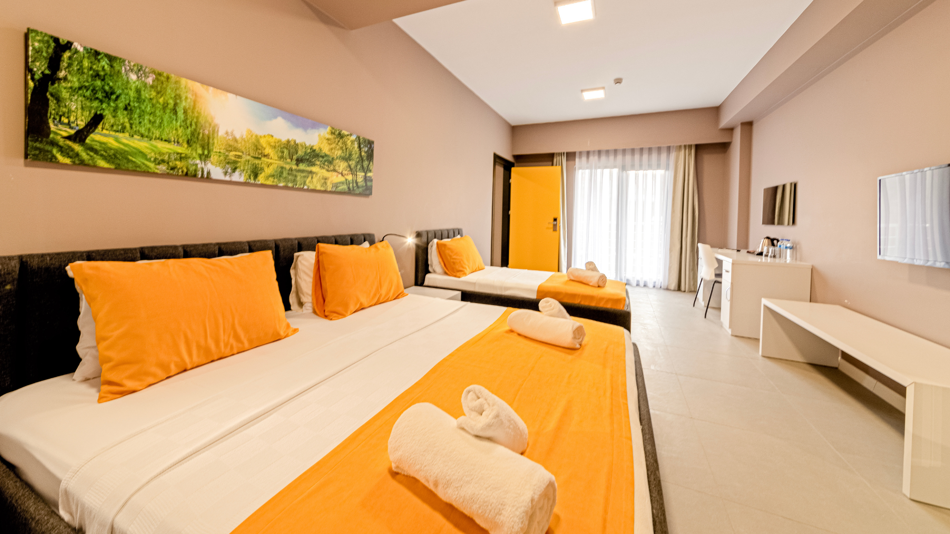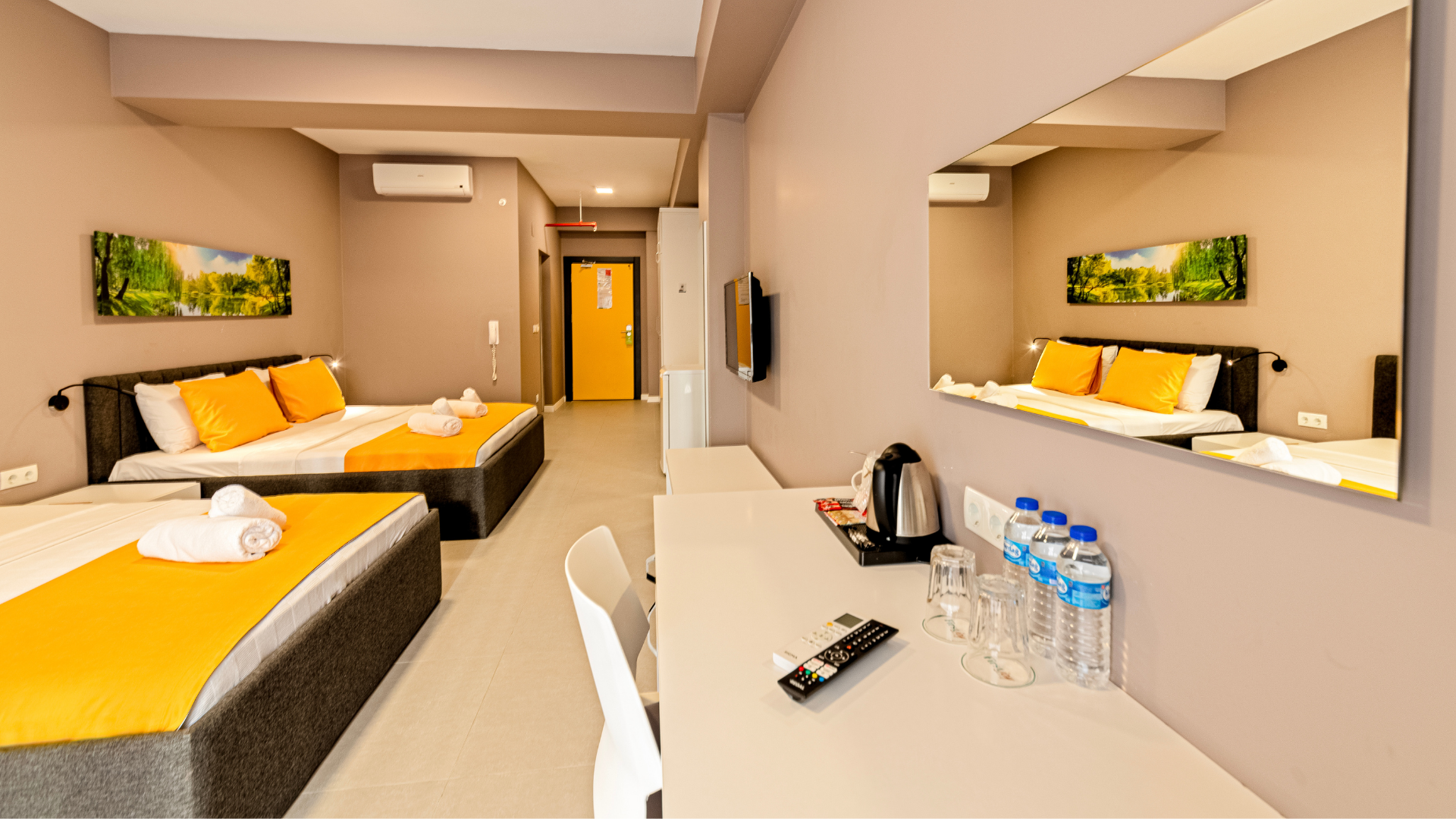 Geniş ve ferah alanlar sunan rahat odalarda, her anından keyif alacağınız yepyeni aile boyu tatilin keyfini çıkarın.